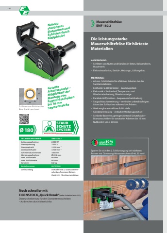 %u00d8180Die leistungsstarke Mauerschlitzfr%u00e4se f%u00fcr h%u00e4rteste MaterialienANWENDUNG:%u2013 Schlitzen von Nuten und Kan%u00e4len in Beton, Kalksandstein, Mauerwerk%u2013 Elektroinstallation, Sanit%u00e4r-, Heizungs-, L%u00fcftungsbauMERKMALE:%u2013 60 mm Schlitzbreite f%u00fcr effektives Arbeiten bei der Sanit%u00e4rinstallation %u2013 kraftvoller 2.300 W Motor %u2013 durchzugsstark%u2013 Elektronik %u2013 Sanftanlauf, Temperatur- und %u00dcberlastabschaltung, %u00dcberlastanzeige%u2013 Parallele Griffposition %u2013 bequeme Arbeitshaltung%u2013 Saugschlaucharretierung %u2013 verhindert unbeabsichtigtes L%u00f6sen des Schlauches w%u00e4hrend des Fr%u00e4sens%u2013 Werkzeuglos einstellbare Schlitztiefe%u2013 Spindelarretierung %u2013 einfacher Werkzeugwechsel%u2013 Schlanke Bauweise, geringer Abstand Schutzhaube %u2013 Diamantscheiben f%u00fcr randnahes Arbeiten bis 15 mm%u2013 Nutbreiten von 7-60 mmSparen Sie sich den 2. Schlitzvorgang bei st%u00e4rkerenRohren mit D%u00e4mmung/Abwasserrohren %u00d8 40, 50 mm!Mauerschlitzfr%u00e4seEMF 180.2Schlitzen von Rohrkan%u00e4lenBitte Statik beachten!Geteilte Arbeitsspindel %u2013 M%u00f6glichkeit der Montage von Fugenfr%u00e4sscheiben bis 10 mm Segmentst%u00e4rkemind. 50 %ZeitersparnisSTAUBSCHUTZSYSTEMMineralische St%u00e4ube k%u00f6nnen krebserzeugend sein!TECHNISCHE DATEN EMF 180.2Leistungsaufnahme 2.300 WNennspannung 230 V ~Nenndrehzahl 2.200 min-1Leerlaufdrehzahl 3.100 min-1Scheibendurchmesser 180 mmWerkzeugaufnahme %u00d8 22,2 mmmax. Schlitztiefe 60 mmmax. Schlitzbreite 60 mmGewicht 8,2 kgBestellnummer 0672C000Lieferumfang im Koffer inkl. 2 Diamanttrennscheiben Premium (Beton), Ausbrech-, MontagewerkzeugNahezu staubfreies Eintauchen und Schlitzen durch KlapphaubeNoch schneller mitEIBENSTOCK %u201eQuick Break%u201c(siehe Zubeh%u00f6r Seite 122)Distanzscheibensatz f%u00fcr drei Diamanttrennscheiben %u2013 Ausbrechen durch Mittelschlitz120