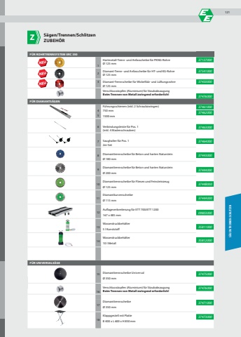 123456789101112131415161718371370003754100037450000374760003746100037462000374630003746400037443000374440003744B0003744A00009803000358110003581200037475000374760003747100037473000S%u00e4gen/Trennen/Schlitzen Z ZUBEH%u00d6RS%u00c4GEN/TRENNEN/SCHLITZENHartmetall-Trenn- und Anfasscheibe f%u00fcr PKNG-Rohre%u00d8 125 mmDiamant-Trenn- und Anfasscheibe f%u00fcr HT- und KG-Rohre%u00d8 125 mmDiamant-Trennscheibe f%u00fcr Wickelfalz- und L%u00fcftungsrohre%u00d8 125 mmVerschlussstopfen (Aluminium) f%u00fcr StaubabsaugungBeim Trennen von Metall zwingend erforderlich!F%u00fchrungsschienen (inkl. 2 Schraubzwingen)750 mm1500 mmVerbindungsleiste f%u00fcr Pos. 1(inkl. 4 Madenschrauben)Saughalter f%u00fcr Pos. 12er-SetDiamanttrennscheibe f%u00fcr Beton und harten Naturstein%u00d8 180 mmDiamanttrennscheibe f%u00fcr Beton und harten Naturstein%u00d8 200 mmDiamanttrennscheibe f%u00fcr Fliesen und Feinsteinzeug%u00d8 125 mmDiamantkurvenscheibe%u00d8 115 mmAufl ageverbreiterung f%u00fcr ETT 700/ETT 1200167 x 485 mmWasserdruckbeh%u00e4lter5 l KunststoffWasserdruckbeh%u00e4lter10 l MetallDiamanttrennscheibe Universal%u00d8 350 mmVerschlussstopfen (Aluminium) f%u00fcr StaubabsaugungBeim Trennen von Metall zwingend erforderlich!Diamanttrennscheibe%u00d8 350 mmKlappgestell mit PlatteB 400 x L 600 x H 850 mmF%u00dcR ROHRTRENNSYSTEM ERC 350F%u00dcR DIAMANTS%u00c4GENF%u00dcR UNIVERSALS%u00c4GE121