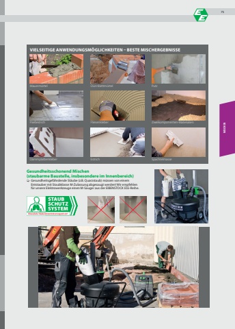 Gesundheitsschonend Mischen(staubarme Baustelle, insbesondere im Innenbereich)%uf0ed Gesundheitsgef%u00e4hrdende St%u00e4ube (z.B. Quarzstaub) m%u00fcssen von einem Entstauber mit Staubklasse M-Zulassung abgesaugt werden! Wir empfehlen f%u00fcr unsere Elektrowerkzeuge einen M-Sauger aus der EIBENSTOCK ESS-Reihe.VIELSEITIGE ANWENDUNGSM%u00d6GLICHKEITEN %u2013 BESTE MISCHERGEBNISSEMauerm%u00f6rtelD%u00e4mmplattenkleberFlie%u00dfestrichEstrichFliesenkleber Zweikomponenten-MaterialienSpachtelmasseD%u00fcnnbettm%u00f6rtel PutzMISCHENSTAUBSCHUTZSYSTEMMineralische St%u00e4ube k%u00f6nnen krebserzeugend sein!75