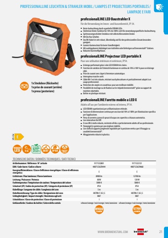 professionalLINE LED Baustrahler XF%u00fcr die Verwendung im Innen- und Aussenbereich, IP 54.%u25a0 Beste Ausleuchtung durch superhelle OSRAM LEDs.%u25a0 Stufenlose Dimm-Funktion f%u00fcr 10% bis 100% Licht f%u00fcr anwendungsspezifische Ausleuchtung.%u25a0 Spritzwassergesch%u00fctzte Steckdose mit selbstschliessendem Deckel.%u25a0 Mit Ein/Aus Schalter.%u25a0 Das RN-Kabel ist sehr robust, %u00f6lbest%u00e4ndig und f%u00fcr den professionellen Einsatz besonders geeignet.%u25a0 Gummi-Kantenschutz f%u00fcr beste Standfestigkeit.%u25a0 Mit ausklappbarem Halteb%u00fcgel zum Aufstellen oder Befestigen auf brennenstuhl%u00ae Stativen.%u25a0 Robustes Kunststoffgeh%u00e4use.professionalLINE Projecteur LED portable XPour une utilisation int%u00e9rieure et ext%u00e9rieure, IP54.%u25a0 Eclairage performant gr%u00e2ce %u00e0 des LED OSRAM tr%u00e8s claires.%u25a0 Fonction de variation de l%u2019intensit%u00e9 lumineuse en continu de 10% %u00e0 100 % pour un %u00e9clairage cibl%u00e9.%u25a0 Prise de courant avec clapet %u00e0 fermeture automatique.%u25a0 Interrupteur marche-arr%u00eat.%u25a0 C%u00e2ble RN-F est tr%u00e8s robuste, r%u00e9sistant aux hydrocarbures et particuli%u00e8rement adapt%u00e9 %u00e0 un usage professionnel.%u25a0 Protection des angles en caoutchouc pour une meilleure stabilit%u00e9.%u25a0 Possibilit%u00e9 de montage ou de fixation sur les tr%u00e9pieds brennenstuhl%u00ae gr%u00e2ce au support de maintien rabattable.%u25a0 Bo%u00eetier en plastique r%u00e9sistant.professionalLINE Faretto mobile a LED XAdatto all%u2019uso per l%u2019ambiente esterno ed interno, IP 54.%u25a0 LED OSRAM superluminosi per un%u2019illuminazione ottimale.%u25a0 Funzione di dimmerazione continua per una luce dal 10% al 100% per illuminazione specifica per l%u2019applicazione.%u25a0 Presa di corrente a prova di spruzzi d%u2019acqua con coperchio a chiusura automatica.%u25a0 Con interruttore On/Off.%u25a0 Il cavo RN %u00e8 molto robusto, resistente all%u2019olio e particolarmente adatto all%u2019uso professionale.%u25a0 Paraspigoli in gomma per una migliore stabilit%u00e0.%u25a0 Con staffa di supporto pieghevole regolabile per la posizione eretta o per il fissaggio su cavalletti brennenstuhl%u00ae.%u25a0 Alloggiamento robusto in plastica.OSRAMLED 5m IK07 IP54 CH/T13IP55TECHNISCHE DATEN / DONN%u00c9ES TECHNIQUES / DATI TECNICIArtikelnummer/ R%u00e9f%u00e9rence / N%u00b0 articolo 9171332801 9171332121EAN/ Code-barre / Codice a Barre 4007123670444 4007123670468Energieeffizienzklasse / Classe d%u2019efficience %u00e9nerg%u00e9tique / Classe di efficienza energetica E ELichtstrom/ Flux lumineux/ Flusso Luminoso 8900 lm 12700 lmLeistung / Puissance / Potenza 80 W 120 WFarbtemperatur/ Temp%u00e9rature de couleur/ Temperatura del colore 5000 K 5000 KSchutzart (IP)/ Indice de protection (IP)/ Categoria di protezione (IP) IP54 IP54Kabell%u00e4nge / Longueur de c%u00e2ble / Lunghezza del cavo 5 m 5 mKabelbezeichnung / Type de c%u00e2ble / Designazione del cavo H07RN-F 3G1,5 H07RN-F 3G1,5Schlagfestigkeit / Impact strength / Resistenza agli urti IK07 IK07Schutzklasse / Classe de protection / Classe di protezione I I Geh%u00e4usefarbe / Couleur du bo%u00eetier/ Colore della scatola schwarz/orange/ noir/orange/ nero/arancione schwarz/orange/ noir/orange/ nero/arancione8900LUMEN12700LUMEN1x Steckdose (R%u00fcckseite)1x prise de courant (arri%u00e8re)1x presa (posteriore)PROFESSIONALLINE LEUCHTEN & STRAHLER MOBIL/LAMPES ET PROJECTEURS PORTABLES/LAMPADE E FARI WWW.BRENNENSTUHL.COM 21