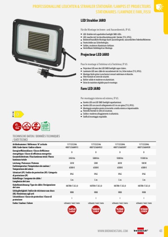 WWW.BRENNENSTUHL.COM 43PROFESSIONALLINE LEUCHTEN & STRAHLER STATION%u00c4R /LAMPES ET PROJECTEURS STATIONAIRES/LAMPADE E FARI, FISSILED Strahler JAROF%u00fcr die Montage im Innen- und Aussenbereich, IP 65.%u25a0 LED-Strahler mit superhellen Everlight SMD-LEDs.%u25a0 LED-Leuchte mit 5m Anschlussleitung inkl. Stecker (T13, IP55).%u25a0 Bedienerfreundliche Montage durch aussenliegende, wasserdichten Federkraftklemme.%u25a0 Frontscheibe aus Sicherheitsglas.%u25a0 Solides, modernes Aluminium-Geh%u00e4use.%u25a0 Verstellbarer Halteb%u00fcgel zur Montage.Projecteur LED JAROPour le montage %u00e0 l%u2019int%u00e9rieur et %u00e0 l%u2019ext%u00e9rieur, IP 65.%u25a0 Projecteur LED avec des LED SMD Everlight super claires.%u25a0 Luminaire LED avec c%u00e2ble de raccordement de 5 m, fiche incluse (T13, IP55).%u25a0 Montage facile gr%u00e2ce %u00e0 une borne %u00e0 ressort ext%u00e9rieure et %u00e9tanche.%u25a0 Vitre frontale en verre de s%u00e9curit%u00e9.%u25a0 Bo%u00eetier solide et moderne en aluminium.%u25a0 Etrier de maintien r%u00e9glable pour le montage.Faro LED JAROPer montaggio interno ed esterno, IP 65.%u25a0 Faretto LED con LED SMD Everlight superluminosi.%u25a0 Faretto LED con cavo di collegamento di 5 m con spina (T13, IP55).%u25a0 Montaggio semplice grazie al morsetto a molla esterno e impermeabile.%u25a0 Pannello frontale in vetro di sicurezza.%u25a0 Solido e moderno alloggiamento in alluminio.%u25a0 Staffa di montaggio regolabile.5m IK08 IP65TECHNISCHE DATEN / DONN%u00c9ES TECHNIQUES / DATI TECNICIArtikelnummer/ R%u00e9f%u00e9rence / N%u00b0 articolo 1171252346 1171252546 1171252846 1171252046EAN/ Code-barre / Codice a Barre 4007123684915 4007123684922 4007123685097 4007123684939Energieeffizienzklasse / Classe d%u2019efficience %u00e9nerg%u00e9tique / Classe di efficienza energetica D D D DGesamtlichtstrom/ Flux lumineux total/ Flusso luminoso totale 3450 lm 5800 lm 9200 lm 11500 lmLeistung / Puissance / Potenza 30 W 50W 80 W 100 WFarbtemperatur/ Temp%u00e9rature de couleur/ Temperatura del colore 6500 K 6500 K 6500 K 6500 KSchutzart (IP)/ Indice de protection (IP)/ Categoria di protezione (IP) IP65 IP65 IP65 IP65Kabell%u00e4nge / Longueur de c%u00e2ble / Lunghezza del cavo 5 m 5 m 5 m 5 mKabelbezeichnung / Type de c%u00e2ble / Designazione del cavo H07RN-F 3G1,0 H07RN-F 3G1,0 H07RN-F 3G1,0 H07RN-F 3G1,0Schlagfestigkeit/ Indice de r%u00e9sistance aux chocs (IK)/ Resistenza agli urti IK08 IK08 IK08 IK08Schutzklasse / Classe de protection / Classe di protezione I I I IFarbe / Couleur/ Colore schwarz/ noir/ nero schwarz/ noir/ nero schwarz/ noir/ nero schwarz/ noir/ nero3450LUMEN5800LUMEN9200LUMEN11500LUMEN
