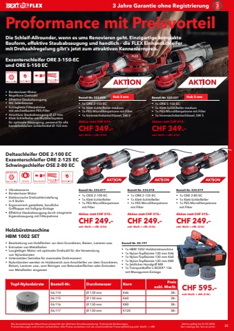 Die Ausstattung der Maschinen entspricht der %u00fcblichen Grundausstattung. Technische %u00c4nderungen, Preis%u00e4nderungen und Irrtum vorbehalten. Alle Preise verstehen sich als unverbindliche Preisempfehlung exkl. MwSt. + vRB. 25 Aktion g%u00fcltig bis 31.03.2026Nur solange der Vorrat reicht3 Jahre Garantie ohne Registrierung%u0083 Vibrationsarm%u0083 B%u00fcrstenloser Motor%u0083 Elektronische Drehzahleinstellung in 4 Stufen%u0083 Ergonomisch gestaltete, handliche Griffkappe mit Softgrip-Einlage%u0083 Effektive Staubabsaugung durch integrierte Eigenabsaugung mit FilterpatroneDeltaschleifer ODE 2-100 ECExzenterschleifer ORE 2-125 ECSchwingschleifer OSE 2-80 ECProformance mit PreisvorteilBestell-Nr. 532.018%u0083 1x ORE 2-125 EC%u0083 1x Klett-Schleifteller%u0083 1x PES-Microfilterpatrone mit FilterBestell-Nr. 532.019%u0083 1x OSE 2-80 EC%u0083 1x Klett-Schleifteller%u0083 1x PES-Microfilterpatrone mit FilterBestell-Nr. 532.017%u0083 1x ODE 2-100 EC%u0083 1x Klett-Schleifteller%u0083 1x PES-Microfilterpatrone mit FilterExzenterschleifer ORE 3-150-EC und ORE 5-150 ECDie Schleif-Allrounder, wenn es ums Renovieren geht. Einzigartige kompakte Bauform, effektive Staubabsaugung und handlich %u2013 die FLEX Einhandschleifer mit Drehzahlregelung gibt%u2019s jetzt zum attraktiven Kennenlernpreis.%u0083 B%u00fcrstenloser Motor%u0083 Regelbare Drehzahl%u0083 Effektive Staubabsaugung%u0083 Mit Tellerbremse%u0083 Schlagfeste Filterpatrone mit wechselbarem PES-Filter%u0083 Anschluss Staubabsaugung %u00d8 27 mm%u0083 Klett-Schleifteller mit Multilochsystem f%u00fcr optimale Absaugung, passend f%u00fcr alle handels%u00fcblichen Schleifmittel %u00d8 150 mmBestell-Nr. 532.020%u0083 1x ORE 3-150 EC%u0083 1x Klett-Schleifteller medium%u0083 1x PES-Microfilterpatrone mit Filter%u0083 1x Innensechskantschl%u00fcssel, SW 5Bestell-Nr. 532.021%u0083 1x ORE 5-150 EC%u0083 1x Klett-Schleifteller medium%u0083 1x PES-Microfilterpatrone mit Filter%u0083 1x Innensechskantschl%u00fcssel, SW 5Topf-Nylonb%u00fcrste Bestell-Nr. Durchmesser Korn Preisexkl. MwSt.06.114 %u00d8 130 mm K46 38.%u201306.115 %u00d8 130 mm K60 38.%u201306.116 %u00d8 130 mm K80 38.%u201306.117 %u00d8 130 mm K120 38.%u2013Holzb%u00fcrstmaschineHBM 1002 SET%u0083 Bearbeitung von Holzfl%u00e4chen vor dem Grundieren, Beizen, Lasieren usw.%u0083 Entrosten von Metallteilen%u0083 Langlebiger Motor mit optimaler Drehzahl f%u00fcr die Verwendung von Nylonb%u00fcrsten%u0083 Untersetztes Getriebe f%u00fcr maximales Drehmoment%u0083 Nylonb%u00fcrsten werden im Holzbereich zum Anschleifen vor dem Grundieren, Beizen, Lasieren usw., zum Reinigen von Betonoberfl%u00e4chen oder Entrosten von Metallteilen eingeseztBestell-Nr. 50.197%u0083 1x HBM 1002 Holzb%u00fcrstmaschine%u0083 1x Nylon-Topfb%u00fcrste 130 mm K46%u0083 1x Nylon-Topfb%u00fcrste 130 mm K60%u0083 1x Nylon-Topfb%u00fcrste 130 mm K80%u0083 1x Seitlicher Handgriff M8%u0083 1x Transportkoffer L-BOXX%u00ae 136mit Moosgummi-EinlageCHF 595.%u2013exkl. MwSt. + vRB. (0.56)Aktion statt CHF 410.%u2013CHF 349.%u2013exkl. MwSt. + vRB. (0.56)Aktion statt CHF 410.%u2013CHF 349.%u2013exkl. MwSt. + vRB. (0.56)Aktion statt CHF 315.%u2013CHF 249.%u2013exkl. MwSt. + vRB. (0.56)Aktion statt CHF 315.%u2013CHF 249.%u2013exkl. MwSt. + vRB. (0.56)Aktion statt CHF 315.%u2013CHF 249.%u2013exkl. MwSt. + vRB. (0.56)Hub 3 mm Hub 5 mm