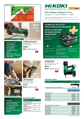 Fokus Magazin/Magazine FocusAusgabe 2 %u2013 2025/%u00c9dition 2 %u2013 2025Laufzeit vom 1. Oktober 2025 bis 31. M%u00e4rz 2026/Valable du 1er octobre 2025 au 31 mars 2026Preise in CHF, exkl. MWST/Prix en CHF, hors TVAIhr HiKOKI-Fachh%u00e4ndler:Aktionsprodukte auf der Innenseite gekennzeichnetProduits en promotion indiqu%u00e9s %u00e0 l'int%u00e9rieurDie Anzahl der Bonus-Akkus ist auf maximal 5 pro Teilnehmer begrenztLe nombre de batteries bonus est limit%u00e9 %u00e0 un maximum de 5 par participant1.Kaufen Sie ein HiKOKI-Ger%u00e4t aus der AktionAchetez un appareil HiKOKI issu de la promotion2.Scannen Sie die H%u00e4ndler-Rechnung mit Seriennummer und senden Sie diese mit Betreff \info@revotool.chScannez la facture du revendeur avec le num%u00e9ro de s%u00e9rie et envoyez-la avec pour objet %u00ab Promotion batterie gratuite %u00bb %u00e0 : info@revotool.ch3.Sichern Sie sich Ihren kostenlosen MultiVolt-Akku BSL36A18XObtenez gratuitement votre batterie MultiVolt BSL36A18XNEUCV18DMA (Basic) (HSC II)Akku-Multitool Starlock MaxOutil multifonction sans fil Starlock Max18V - 1,3 kg - 4,0%u00b0349.%u2013 77.%u2013 (Service All-incl.)NEUSWAP.CLICK.GO.NEUMAKETHE CUTC3609DUM (Basic)Akku-Handkreiss%u00e4geScie circulaire %u00e0 main sans fil36V - 85 mm - 5,6 kg711.%u2013 156.%u2013 (Service All-incl.)NEU%u2022 Einh%u00e4ndiger undwerkzeugloserWerkzeugwechsel%u2022 Starlock MAX:kompatibel mits%u00e4mtlichem StarlockZubeh%u00f6r%u2022 Ergonomisch: UVP,vibrationsarm, schlankerGriffumfangBEZEICHNUNG ART.-NR. PREISF%u00fchrungsschienenF%u00fchrungsschiene GR800 (L%u00e4nge 80 cm)4100071 105.%u2013F%u00fchrungsschiene GR1600 (L%u00e4nge 160 cm)4100072 164.%u2013Kompatibles Zubeh%u00f6rBEZEICHNUNG ART.-NR. PREISErweitertes Magazin (4 Nagelstreifen) 382819 195.%u2013Stifte f%u00fcr Beton2.6 x 20 mm 4100461 105.%u20132.6 x 25 mm 4100462 110.%u20132.6 x 30 mm 4100463 123.%u20132.6 x 35 mm 4100464 135.%u20132.6 x 40 mm 4100465 160.%u2013Stifte f%u00fcr Hartbeton und Stahl3.0 x 15 mm 4100467 98.%u20133.0 x 17 mm 4100468 105.%u20133.0 x 22 mm 4100469 115.%u20133.0 x 27 mm 4100470 125.%u20133.0 x 32 mm 4100471 138.%u20133.0 x 40 mm 4100472 150.%u2013Kompatibles Zubeh%u00f6r%u2022 maximale Schnittkapazit%u00e4t 85 mm%u2022 Drehmoment-Boost f%u00fcr leistungsintensiveSchneidarbeiten%u2022 Kompatibel mitF%u00fchrungsschienen vielerMarkenNC1840DA (Basic)Akku-BetonnaglerCloueuse pour b%u00e9ton %u00e0 batterie18V - 15%u201340 mm - 4,1 kg914.%u2013 201.%u2013 (Service All-incl.)NEUJede Schachtel enth%u00e4lt 1000 N%u00e4gel.Aktionsprodukte auf der Innenseite gekennzeichnetProduits en promotion indiqu%u00e9s %u00e0 l'int%u00e9rieurDS18DA_PBAkku Bohrschrauber 18VPerceuse-visseuse sans fil 18V50 Nm - 0.9 kg249 .%u201381.%u2013 (Service All-incl.)AktionIm Lieferumfang enthalten:2%u00d7 Akku BSL1820M, 1%u00d7 Ladeger%u00e4t UC18YKSL, 100-tlg. Zubeh%u00f6rContenu de la livraison:2%u00d7 batterie BSL1820M, 1%u00d7 chargeur UC18YKSL, 100 pcs. d'accessoiresDS18DE_PBAkku Bohrschrauber 18VPerceuse-visseuse sans fil 18V70 Nm - 1,2 kg569.%u2013154.%u2013 (Service All-incl.)AktionIm Lieferumfang enthalten:2%u00d7 Akku BSL3618X, 1%u00d7 Ladeger%u00e4t UC18YSL3, 100-tlg. Zubeh%u00f6rContenu de la livraison:2%u00d7 batterie BSL3618X, 1%u00d7 chargeur UC18YSL3, 100 pcs. d'accessoiresDS18DDQ (2.0) (HSC II)Akku Bohrschrauber QuickPerceuse-visseuse sans fil Quick55 Nm - 0,9 kg / Inkl. Zubeh%u00f6r333.%u201388.%u2013 (Service All-incl.)AktionIm Lieferumfang enthalten:2%u00d7 Akku BSL1820M, 1%u00d7 Ladeger%u00e4t UC18YFSL, Bithalter, versetzter Bithalter und WinkelaufsatzContenu de la livraison:2%u00d7 batterie BSL1820M, 1%u00d7 chargeur UC18YFSL, 4 embouts diff%u00e9rentsN1804DA (Basic) (HSC III)Akku T%u00e4fernaglerAgrafeuse lambris sans filK90 - 13%u201340 mm - 2 kg599.%u2013 132.%u2013 (Service All-incl.)NEUDS18DE (Basic) (HSC II)Akku-BohrschrauberPerceuse-visseuse18V - 70/40 Nm218 .%u201360.%u2013 (Service All-incl.)AktionDH3628DA (Basic) (HSC IV)Akku-Bohr und MeisselhammerMarteau perforateur et burineur sans fil36V - 28 mm - 3,2 J - SDS plus469 .%u2013118.%u2013 (Service All-incl.)AktionG3613DVE (Basic) (HSC III)Akku-WinkelschleiferMeuleuse d'angle sans fil36V - %u00d8 125 mm266 .%u201385.%u2013 (Service All-incl.)AktionNEUUC18DAPower-ChargerPower-Charger18V und MULTI-VOLT-Akkupacks114.%u2013 25.%u2013 (Service All-incl.)NEURE%u00c7OIS TA BATTERIE BSL36A18X BONUS MAINTENANTAVEC ENREGISTREMENTLe nombre de batteries bonus est limit%u00e9 %u00e0 un maximum de 5 par participantSICHERN SIE SICH JETZT IHREN BONUSAKKU BSL36A18XBEI REGISTRIERUNGDie Anzahl der Bonus-Akkus ist auf maximal 5 pro Teilnehmer begrenztSICHERN SIE SICH JETZT IHREN BONUSAKKU BSL36A18XRE%u00c7OIS TA BATTERIE BSL36A18X BONUS MAINTENANT %u2022 Elektrowerkzeuge %u2022 Rasenm%u00e4her %u2022 Benzin-Ger%u00e4te %u2022 Kleinger%u00e4te %u2022 Verkauf und Rep.Fux Elektrowerkzeuge GmbHDorfstrasse 20b %u2022 4444 R%u00fcmlingen062 791 44 44079 247 44 44062 299 26 74Telefon:Natel:Fax:info@fuxtools.ch %u2022 www.fuxtools.ch