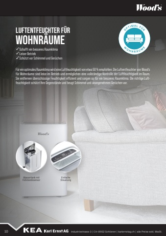 LUFTENTFEUCHTER F%u00dcRWOHNR%u00c4UMEF%u00fcr ein optimales Raumklima wird eine Luftfeuchtigkeit von etwa 50 % empfohlen. Die Luftentfeuchter von Wood%u2018s f%u00fcr Wohnr%u00e4ume sind leise im Betrieb und erm%u00f6glichen eine vollst%u00e4ndige Kontrolle der Luftfeuchtigkeit im Raum. Sie entfernen %u00fcbersch%u00fcssige Feuchtigkeit effizient und sorgen so f%u00fcr ein besseres Raumklima. Die richtige Luftfeuchtigkeit sch%u00fctzt Ihre Gegenst%u00e4nde und beugt Schimmel und unangenehmen Ger%u00fcchen vor.Schafft ein besseres RaumklimaLeiser BetriebSch%u00fctzt vor Schimmel und Ger%u00fcchenEinfacheSteuerungWassertank mitF%u00fcllstandssensor10 Industriestrasse 3 | CH-8952 Schlieren | karlernstag.ch | alle Preise exkl. MwSt.