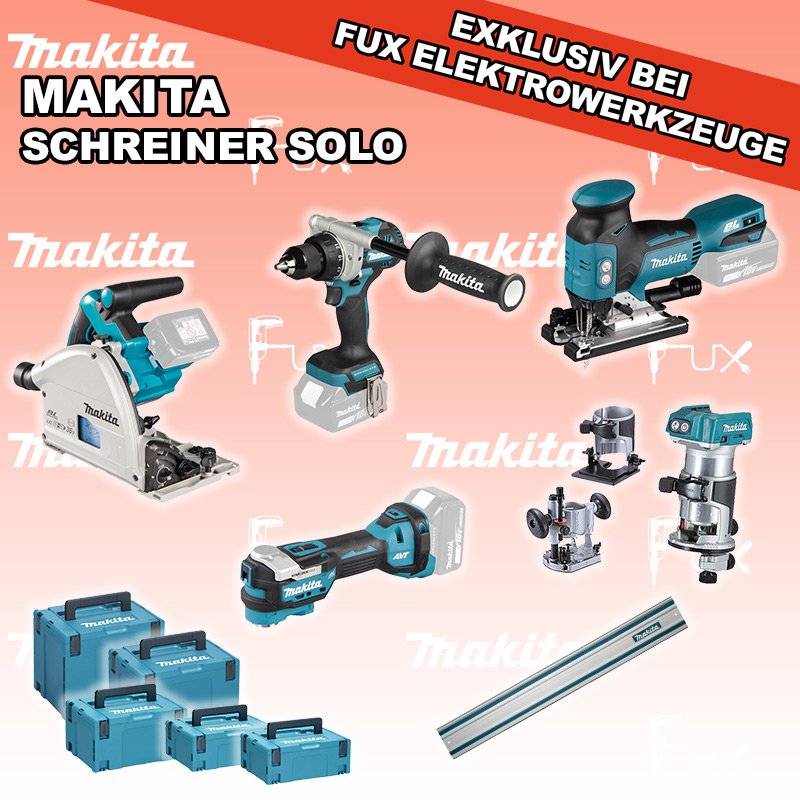 Zu "Schreiner Set" von Makita FUX SPECIAL EXKLUSIV BEI FUX Makita Schreiner Set 1 SOLO Bestell- und Artikelnummer: maSchreiner Set 1 SOLO DSP600ZJ Eintauch-KreissägeAkkuspannung 2 x 18 V Sägeblatt (Ø) 165 mm Schnitttiefe bei 90° 56 mm Gewicht 5.1 kg Infos DTM52Z Multifunktions WerkzeugAkkuspannung 18 V Schwingungen 10000 - 20000 min-1 Werkzeugaufnahme Starlock Max System Gewicht inkl. Akku 2.0 kg Infos DJV18ZJ Akku-StichsägeAkkuspannung 18 V Hubzahl 800 - 3500/ min Schnittleistung Holz 135 mm / Stahl 10 mm Gewicht 2.5 kgInfos DRT50ZJX11 Akku-Einhandfräse / Kantenfräse Akkuspannung 18 V Leerlaufdrehzahl 10000 - 30000 min-1 Tiefeneinstellung bis 40 mm Gewicht 2.0 kgInfos DDF492Z Akku-BohrschrauberAkkuspannung 18 V Leerlaufdrehzahl 0 - 550 / 0 - 2100 min⁻¹ Drehmoment hart / weich 130 / 65 Nm Gewicht inkl. Akku 2.3 - 2.6 kgInfos Führungsschiene L = 140 cmgeeignet für SP6000 Handkreissäge mit passenden Adapter Auch für weitere Handkreissägen und Stichsägen geeignet mit passendem Adapter. ( 194579-2 )Infos MAKPAC Gr. 2Produktabmessung (L x B x H) 395 x 295 x 163 mm Infos MAKPAC Gr. 3Produktabmessung (L x B x H) 377 x 277 x 176 mm Infos Einsatz für diverse Akkuschrauber Einsatz für DDF343ZJ, DDF441, DDF446, DDF448, DDF451, DDF453, DDF456R, DDF458, DDF459, DDF480, DDF481, DDF482, DDF484, DDF485, DDF486, DHP441, DHP446, DHP448, DHP451, DHP456, DHP458, DHP459, DHP470, DHP480, DHP481, DHP482, DHP484, DHP485, DHP486, DLX2126TJ1, DLX3092TJInfos Einsatz für DTM52 Einsatz für DTM52 Makpac Koffer Typ C (821551-8) Infos OHNE AKKUS UND LADEGERÄT Standard-Ausrüstung In diesem Set enthalten: DSP600ZJ Eintauch-Kreissäge DTM52Z Multifunktions Werkzeug DJV18ZJ Akku-Stichsäge DRT50ZJX11 Akku-Einhandfräse / Kantenfräse DDF492Z Akku-Bohrschrauber Führungsschiene L = 140 cm MAKPAC Gr. 2 MAKPAC Gr. 3 Einsatz für diverse Akkuschrauber Einsatz für DTM52 Geliefert im Koffer Zubehör Verbrauchsmaterial Listenpreis CHF 2'123.00 Fuxpreis CHF 1'431.00 inklusive 8.1% MwSt Versand CHF 20.00 Kein Grauimport! Produkt bestellen 1 Stück 2 Stück 3 Stück 4 Stück 5 Stück 6 Stück 7 Stück 8 Stück 9 Stück 10 Stück Option: Makita BL 1860 B ( Li-lon Akku ) für CHF 95.- statt CHF 124.-Infos Alle Angaben ohne Gewähr und solange Vorrat reicht!Wiederverkäufer werden? Produkt als PDF NEUHEITAKTION 32%