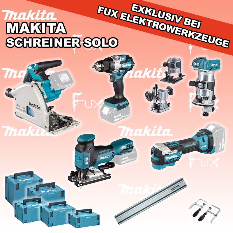 Zu "Schreiner Set" von Makita FUX SPECIAL EXKLUSIV BEI FUX Makita Schreiner Set 5 SOLO Bestell- und Artikelnummer: maSchreiner Set 5 SOLO DSP600ZJ Eintauch-KreissägeAkkuspannung 2 x 18 V Sägeblatt (Ø) 165 mm Schnitttiefe bei 90° 56 mm Gewicht 5.1 kg Infos DTM52Z Multifunktions WerkzeugAkkuspannung 18 V Schwingungen 10000 - 20000 min-1 Werkzeugaufnahme Starlock Max System Gewicht inkl. Akku 2.0 kg Infos DRT50ZJX11 Akku-Einhandfräse / Kantenfräse Akkuspannung 18 V Leerlaufdrehzahl 10000 - 30000 min-1 Tiefeneinstellung bis 40 mm Gewicht 2.0 kgInfos DJV18ZJ Akku-StichsägeAkkuspannung 18 V Hubzahl 800 - 3500/ min Schnittleistung Holz 135 mm / Stahl 10 mm Gewicht 2.5 kgInfos DDF489Z Akku-BohrschrauberAkkuspannung 18 V Leerlaufdrehzahl 0 - 500 / 1800 U/min Drehmoment hart / weich 70 / 40 Nm Gewicht inkl. Akku 1.8 - 2.5 kgInfos Führungsschiene L = 140 cmgeeignet für SP6000 Handkreissäge mit passenden Adapter Auch für weitere Handkreissägen und Stichsägen geeignet mit passendem Adapter. ( 194579-2 )Infos 194385-5 Schraubzwingen für Führungsschienen2 Schraubzwingen für FührungsschienenInfos MAKPAC Gr. 2Produktabmessung (L x B x H) 395 x 295 x 163 mm Infos MAKPAC Gr. 3Produktabmessung (L x B x H) 377 x 277 x 176 mm Infos Einsatz für DTM52 Einsatz für DTM52 Makpac Koffer Typ C (821551-8) Infos Einsatz für diverse Akkuschrauber Einsatz für DDF343ZJ, DDF441, DDF446, DDF448, DDF451, DDF453, DDF456R, DDF458, DDF459, DDF480, DDF481, DDF482, DDF484, DDF485, DDF486, DHP441, DHP446, DHP448, DHP451, DHP456, DHP458, DHP459, DHP470, DHP480, DHP481, DHP482, DHP484, DHP485, DHP486, DLX2126TJ1, DLX3092TJInfos OHNE AKKUS UND LADEGERÄT Standard-Ausrüstung In diesem Set enthalten: DSP600ZJ Eintauch-Kreissäge DTM52Z Multifunktions Werkzeug DRT50ZJX11 Akku-Einhandfräse / Kantenfräse DJV18ZJ Akku-Stichsäge DDF489Z Akku-Bohrschrauber Führungsschiene L = 140 cm 194385-5 Schraubzwingen für Führungsschienen MAKPAC Gr. 2 MAKPAC Gr. 3 Einsatz für DTM52 Einsatz für diverse Akkuschrauber Geliefert im Koffer Zubehör Listenpreis CHF 2'135.00 Fuxpreis CHF 1'388.00 inklusive 8.1% MwSt Versand CHF 20.00 Kein Grauimport! Produkt bestellen 1 Stück 2 Stück 3 Stück 4 Stück 5 Stück 6 Stück 7 Stück 8 Stück 9 Stück 10 Stück Option: Makita BL 1860 B ( Li-lon Akku ) für CHF 95.- statt CHF 124.-Infos Alle Angaben ohne Gewähr und solange Vorrat reicht!Wiederverkäufer werden? Produkt als PDF NEUHEITAKTION 35%