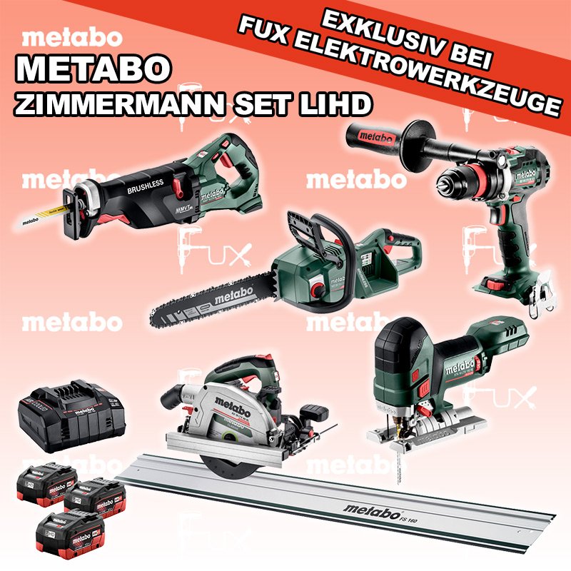 Heute auf dieses Produkt 27% Rabatt! Zu "Zimmermann Set" von Metabo FULL Service: 36 Monate zum Nulltarif für Sie! Weitere Infos zum FULL Service Dieses Produkt ist CAS kompatibel! Weitere Infos zu CAS Sparfux Aktionen FUX SPECIAL EXKLUSIV BEI FUX Metabo Zimmermann SET 16 LiHD Bestell- und Artikelnummer: Zimmermann SET 16 LiHD BS 18 LTX BL Q I Akku-BohrschrauberAkkuspannung 18 V Drehzahl 0-550 / 0-2000 U/min Drehmoment hart / weich 130 / 65 Nm Gewicht (mit Akkupack) 2.3 kgInfos MS 36-18 LTX BL 40 Akku KettensägeAkkuspannung 18 V Schnittlänge 36 cm Max. Kettengeschwindigkeit 22 m/s Gewicht mit Akkupack 4,6 kgInfos SSEP 18 LTX BL MVT Akku-SäbelsägeAkkuspannung 18 V Hubzahl bei Leerlauf 0 - 3.000 /min Gewicht (mit Akkupack) 4.6 kgInfos STA 18 LTX 150 BL Akku-StichsägeAkkuspannung 18 V Hubzahl 1.000-3.500 /min Gewicht ohne Akkupack 1.9 kgInfos KS 18 LTX 66 BL Akku HandkreissägeAkkuspannung 18 V Schnitt-Tiefe bei 90° 0-66 mm Sägeblatt 165 mm Gewicht 4.5 kgInfos FS 160 FührungsschieneGesamtlänge 1600 mmInfos 3 x 18 V, 5.5 Ah, LiHD Akkupack18 V 5.5 Ah ( LiHD Akkus ) Infos ASC 145, 12 - 36 V "Air Cooled" LadegerätZum Aufladen aller Li-Power Schiebesitz-Akkupacks (12 V - 36 V). Ladestrom 8.0 AInfos Registriere die in diesem Set vorhandenen Metabo Maschinen auf metabo.ch, und ergattere dir bis zu 5 Gratis Akkus!Zusätzlich offerieren wir zu diesem Set einen Gratis Akku! Standard-Ausrüstung In diesem Set enthalten: BS 18 LTX BL Q I Akku-Bohrschrauber MS 36-18 LTX BL 40 Akku Kettensäge SSEP 18 LTX BL MVT Akku-Säbelsäge STA 18 LTX 150 BL Akku-Stichsäge KS 18 LTX 66 BL Akku Handkreissäge FS 160 Führungsschiene 3 x 18 V, 5.5 Ah, LiHD Akkupack ASC 145, 12 - 36 V "Air Cooled" Ladegerät Listenpreis CHF 2'581.50 Fuxpreis CHF 1'866.00 inkl. 8.1% MwSt, inkl vRG Versand CHF 25.00 Kein Grauimport! Produkt bestellen 1 Stück 2 Stück 3 Stück 4 Stück 5 Stück 6 Stück 7 Stück 8 Stück 9 Stück 10 Stück Alle Angaben ohne Gewähr und solange Vorrat reicht!Wiederverkäufer werden? Produkt als PDF NEUHEITAKTION 27%