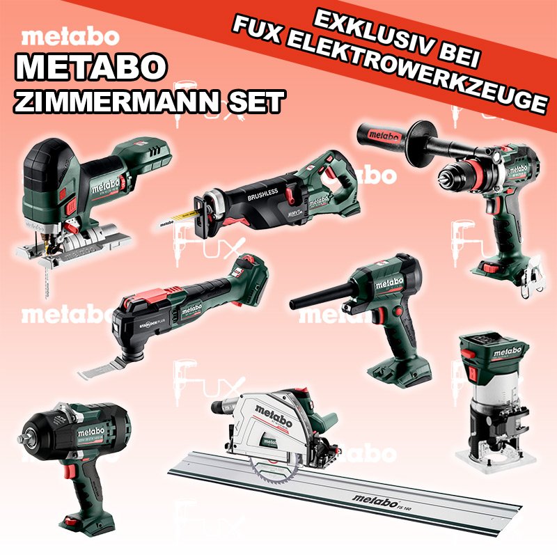 Heute auf dieses Produkt 31% Rabatt! Zu "Zimmermann Set" von Metabo FULL Service: 36 Monate zum Nulltarif für Sie! Weitere Infos zum FULL Service Dieses Produkt ist CAS kompatibel! Weitere Infos zu CAS Sparfux Aktionen FUX SPECIAL EXKLUSIV BEI FUX Metabo Zimmermann SET XXL SOLO Bestell- und Artikelnummer: Zimmermann SET XXL SOLO BS 18 LTX BL Q I Akku-BohrschrauberAkkuspannung 18 V Drehzahl 0-550 / 0-2000 U/min Drehmoment hart / weich 130 / 65 Nm Gewicht (mit Akkupack) 2.3 kgInfos STA 18 LTX 150 BL Akku-StichsägeAkkuspannung 18 V Hubzahl 1.000-3.500 /min Gewicht ohne Akkupack 1.9 kgInfos MT 18 LTX BL QSL Akku-Multitool Akkuspannung 18 V Schwingzahl bei Leerlauf 8.000 - 20.000 /min Schleifplatte, Maß Eck zu Eck 93 mm Gewicht 1.7 kgInfos SSW 18 LTX 1450 BL Akku-SchlagschrauberAkkuspannung 18 V Anziehdrehmoment 1450 Nm Werkzeugaufnahme 1/2" Infos KS 18 LTX 66 BL Akku HandkreissägeAkkuspannung 18 V Schnitt-Tiefe bei 90° 0-66 mm Sägeblatt 165 mm Gewicht 4.5 kgInfos MS 36-18 LTX BL 40 Akku KettensägeAkkuspannung 18 V Schnittlänge 36 cm Max. Kettengeschwindigkeit 22 m/s Gewicht mit Akkupack 4,6 kgInfos SSEP 18 LTX BL MVT Akku-SäbelsägeAkkuspannung 18 V Hubzahl bei Leerlauf 0 - 3.000 /min Gewicht (mit Akkupack) 4.6 kgInfos BP 18 LTX BL Akku Blaspistole Akkuspannung 18 V Luftmenge 0,7 m 3/min Max. Luftgeschwindigkeit 122 m/sInfos FMV 18 LTX BL 8 Akku Kantenfräse Akkuspannung 18 V Leerlaufdrehzahl 4.800 - 29.000 /min Spannbohrung der Spannzange 6 / 8 mmInfos FS 160 FührungsschieneGesamtlänge 1600 mmInfos Registriere die in diesem Set vorhandenen Metabo Maschinen auf metabo.ch, und ergattere dir bis zu 5 Gratis Akkus!Zusätzlich offerieren wir zu diesem Set einen Gratis Akku!OHNE AKKUS UND LADEGERÄT Standard-Ausrüstung In diesem Set enthalten: BS 18 LTX BL Q I Akku-Bohrschrauber STA 18 LTX 150 BL Akku-Stichsäge MT 18 LTX BL QSL Akku-Multitool SSW 18 LTX 1450 BL Akku-Schlagschrauber KS 18 LTX 66 BL Akku Handkreissäge MS 36-18 LTX BL 40 Akku Kettensäge SSEP 18 LTX BL MVT Akku-Säbelsäge BP 18 LTX BL Akku Blaspistole FMV 18 LTX BL 8 Akku Kantenfräse FS 160 Führungsschiene Listenpreis CHF 3'285.50 Fuxpreis CHF 2'236.00 inkl. 8.1% MwSt, inkl vRG Versand CHF 25.00 Kein Grauimport! Produkt bestellen 1 Stück 2 Stück 3 Stück 4 Stück 5 Stück 6 Stück 7 Stück 8 Stück 9 Stück 10 Stück Alle Angaben ohne Gewähr und solange Vorrat reicht!Wiederverkäufer werden? Produkt als PDF NEUHEITAKTION 31%