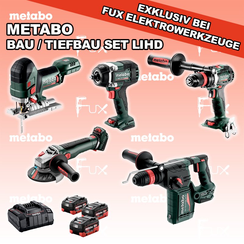 Heute auf dieses Produkt 31% Rabatt! Zu "Bau / Tiefbau Set" von Metabo FULL Service: 36 Monate zum Nulltarif für Sie! Weitere Infos zum FULL Service Sparfux Aktionen FUX SPECIAL EXKLUSIV BEI FUX Metabo Bau / Tiefbau Set 4 LiHD Bestell- und Artikelnummer: Bau / Tiefbau Set 4 LiHD BS 18 LTX BL Q I Akku-BohrschrauberAkkuspannung 18 V Drehzahl 0-550 / 0-2000 U/min Drehmoment hart / weich 130 / 65 Nm Gewicht (mit Akkupack) 2.3 kgInfos STA 18 LTX 150 BL Akku-StichsägeAkkuspannung 18 V Hubzahl 1.000-3.500 /min Gewicht ohne Akkupack 1.9 kgInfos KH 18 LTX BL 28 Q Akku-KombihammerAkkuspannung 18 V Einzelschlagstärke 3 J Bohrleistung in Beton 28 mm Gewicht ohne Akkupack 3,4 kgInfos WB 18 LTX BL 15-125 Quick Akku-Winkelschleifer Akkuspannung 18 V so stark wie ein 1500 Watt Netzgerät Drehzahl 10000 U / min Ø 125 mm Scheiben Gewicht mit Akkupack 2,7 kgInfos SSW 18 LTX 800 BL Akku-Schlagschrauber Akkuspannung 18 V Anziehdrehmoment 800 Nm Werkzeugaufnahme 1/2" Gewicht 2.6 kgInfos 3 x 18 V, 5.5 Ah, LiHD Akkupack18 V 5.5 Ah ( LiHD Akkus ) Infos ASC 145, 12 - 36 V "Air Cooled" LadegerätZum Aufladen aller Li-Power Schiebesitz-Akkupacks (12 V - 36 V). Ladestrom 8.0 AInfos Registriere die in diesem Set vorhandenen Metabo Maschinen auf metabo.ch, und ergattere dir bis zu 5 Gratis Akkus!Zusätzlich offerieren wir zu diesem Set einen Gratis Akku! Standard-Ausrüstung In diesem Set enthalten: BS 18 LTX BL Q I Akku-Bohrschrauber STA 18 LTX 150 BL Akku-Stichsäge KH 18 LTX BL 28 Q Akku-Kombihammer WB 18 LTX BL 15-125 Quick Akku-Winkelschleifer SSW 18 LTX 800 BL Akku-Schlagschrauber 3 x 18 V, 5.5 Ah, LiHD Akkupack ASC 145, 12 - 36 V "Air Cooled" Ladegerät Listenpreis CHF 2'387.00 Fuxpreis CHF 1'624.00 inkl. 8.1% MwSt, inkl vRG Frankolieferung Kein Grauimport! Produkt bestellen 1 Stück 2 Stück 3 Stück 4 Stück 5 Stück 6 Stück 7 Stück 8 Stück 9 Stück 10 Stück Alle Angaben ohne Gewähr und solange Vorrat reicht!Wiederverkäufer werden? Produkt als PDF NEUHEITAKTION 31%