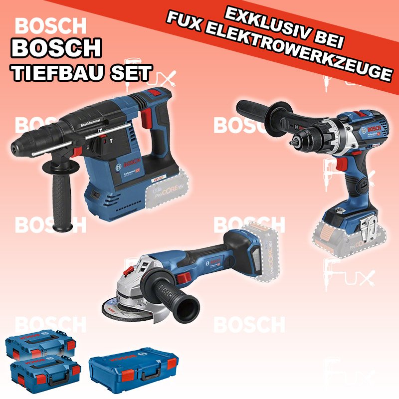 Zu "Bau / Tiefbau Set" von Bosch Professional FUX SPECIAL EXKLUSIV BEI FUX Bosch Professional Tiefbau Set 5 SOLO Bestell- und Artikelnummer: BOTiefbau Set 5 SOLO GSR 18V-110 C Akku-BohrschrauberAkkuspannung 18 V Drehzahlen 0-480 / 0-2100 U/min Drehmoment weich / hart / max. 47 / 85 / 110 Nm Gewicht 2.2 kgInfos GBH 18V-26 F Akku-BohrhammerAkkuspannung 18 V Einzelschlagstärke 2.6 J Bohrleistung in Beton 4 - 26 mm Gewicht Netto 3.0 kgInfos GWS 18V-15 C Akku-Winkelschleifer BiturboAkkuspannung 18 V Leerlaufdrehzahl 11000 U / min 125 mm Scheiben Gewicht inkl. Akku 3.2 kg Infos OHNE AKKUS UND LADEGERÄT Standard-Ausrüstung In diesem Set enthalten: GSR 18V-110 C Akku-Bohrschrauber GBH 18V-26 F Akku-Bohrhammer GWS 18V-15 C Akku-Winkelschleifer Biturbo Geliefert im Koffer Zubehör Listenpreis CHF 1'124.00 Fuxpreis CHF 844.00 inklusive 8.1% MwSt Frankolieferung Kein Grauimport! Produkt bestellen 1 Stück 2 Stück 3 Stück 4 Stück 5 Stück 6 Stück 7 Stück 8 Stück 9 Stück 10 Stück Alle Angaben ohne Gewähr und solange Vorrat reicht! Produkt als PDF NEUHEITAKTION 24%