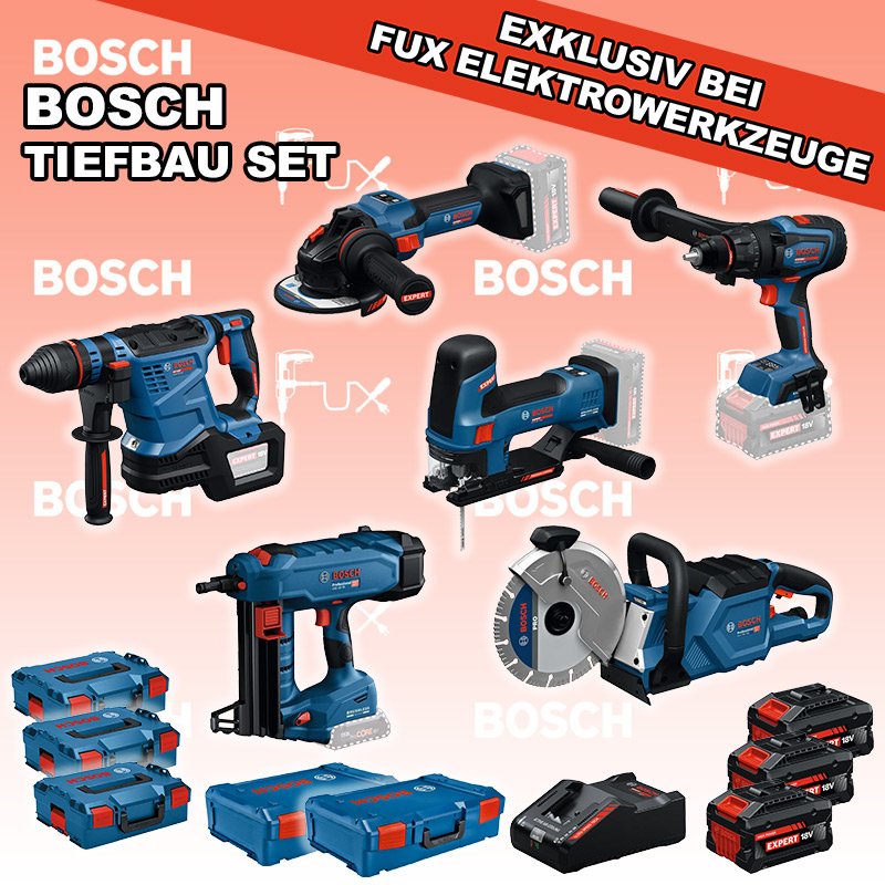 Das Ladenlokal bleibt vom 23. Februar 2026 bis am 28. Februar 2026 geschlossen. Bestellungen und Lieferungen von Neugeräten werden trotz Ferienabwesenheit in gewohnter Fux-Manier entgegengenommen und ausgeliefert. Zu "Bau / Tiefbau Set" von Bosch Professional FUX SPECIAL EXKLUSIV BEI FUX Bosch Expert EXTiefbau Set 12 Bestell- und Artikelnummer: EXTiefbau Set 12 5 Jahre Garantie auf Bosch Expert Maschinen EXSR18V-150 Akku-BohrschrauberAkkuspannung 18 V Drehmoment 84 / 100 / 150 Nm Leerlaufdrehzahl 0 – 550 / 0 – 2200 min⁻¹ Gewicht exkl. Akku 2.1 kgInfos EXBH18V-32F Akku-BohrhammerAkkuspannung 18 V Nenn-Schlagenergie 4.5 J Schlagzahl bei Nenndrehzahl 4300 bpm Nenndrehzahl 0 – 790 min⁻¹ Gewicht exkl. Akku 4.2 kgInfos EXST18V-155S Akku-StichsägeAkkuspannung 18 V Hubzahl bei Leerlauf 800 - 3800 min⁻¹ Hubhöhe 26 mm Gewicht exkl. Akku 1.9 kgInfos EXWS18V-15S Akku-WinkelschleiferAkkuspannung 18 V Leerlaufdrehzahl 11000 min⁻¹ Scheiben-Ø 125 mm Gewicht exkl. Akku 2.2 kgInfos GCS 18V-230 Akku-TrennsägeAkkuspannung 18 V Leerlaufdrehzahl 6’200 m/min Gewicht exkl. Akku 5.35 kgInfos GNB 18V-38 Akku-BetonnaglerAkkuspannung 18 V Nagel-Ø 2.7 – 3 mm Nagellänge 13 – 38 mm Gewicht exkl. Akku 4.1 kgInfos 3x EXBA18V-80 + EXAL18V-160 Starter-Set3 x EXBA18V-80 Akkupack EXAL18V-160 LadegerätInfos Standard-Ausrüstung In diesem Set enthalten: EXSR18V-150 Akku-Bohrschrauber EXBH18V-32F Akku-Bohrhammer EXST18V-155S Akku-Stichsäge EXWS18V-15S Akku-Winkelschleifer GCS 18V-230 Akku-Trennsäge GNB 18V-38 Akku-Betonnagler 3x EXBA18V-80 + EXAL18V-160 Starter-Set Geliefert im Koffer Zubehör Listenpreis CHF 3'952.00 Fuxpreis CHF 3'027.00 inklusive 8.1% MwSt Kostenloser Versand Kein Grauimport! Produkt bestellen 1 Stück 2 Stück 3 Stück 4 Stück 5 Stück 6 Stück 7 Stück 8 Stück 9 Stück 10 Stück Alle Angaben ohne Gewähr und solange Vorrat reicht! Produkt als PDF NEUHEITAKTION 23%